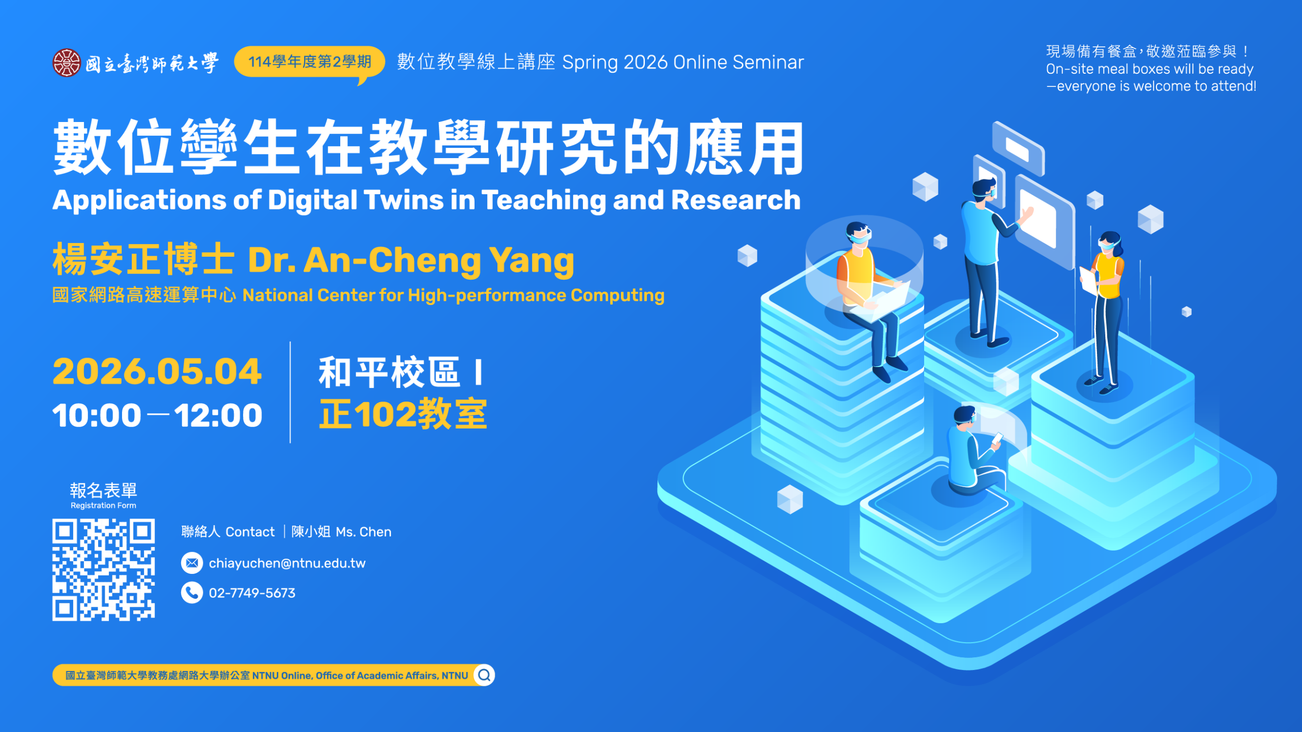若有講座相關問題,歡迎聯繫教務處網路大學辦公室陳小姐 分機5673 / chiayuchen@ntnu.edu.tw- If you have any further queries, please feel free to contact Ms. Chen at ext. 5673 or chiayuchen@ntnu.edu.tw.